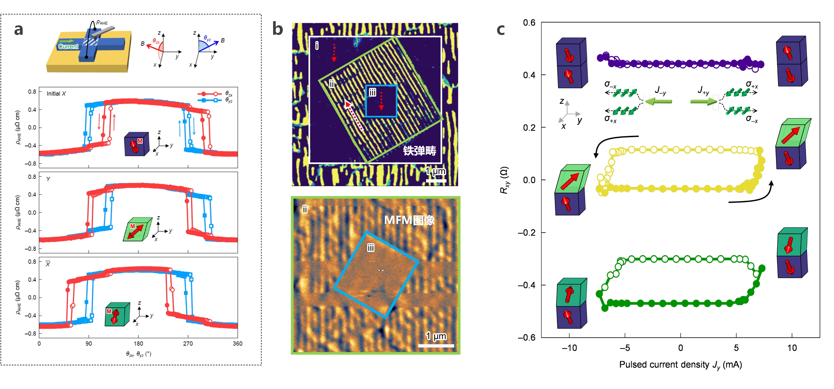 图3 (a)基于晶向选择的铁磁各向异性调控;(b)机械写入的铁弹畴织构的电子通道对比度(ECC)图像及对应磁力显微镜(MFM)图像;(c)具有不同设计的铁磁各向异性垂直不均匀性的SrRuO3(001)的无场自旋轨道矩(SOT)切换回线。