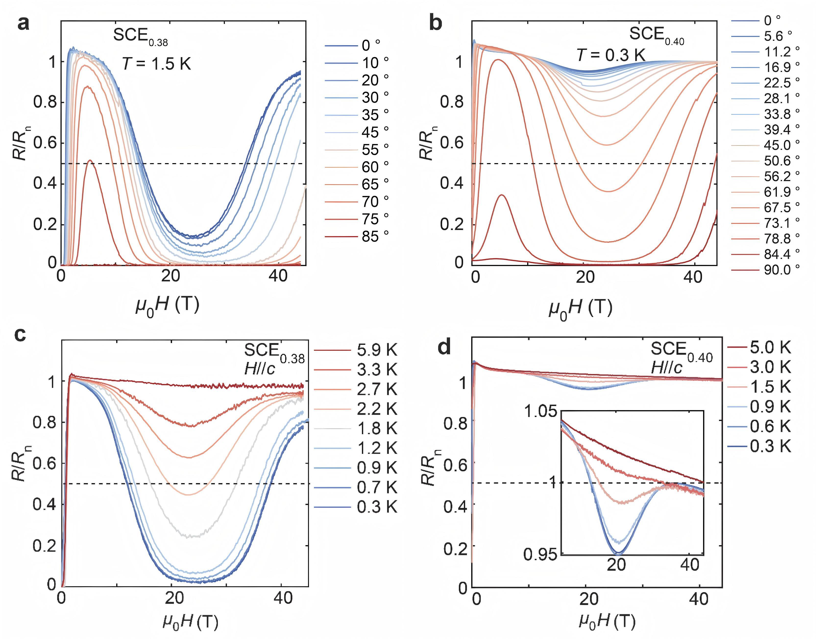 图1. 45T混合磁体极低温旋转电输运测试结果:Eu高掺杂比例SCE0.38和SCE0.40,在低至0.3 K极低温、不同磁场角度下的归一化电阻变化曲线。