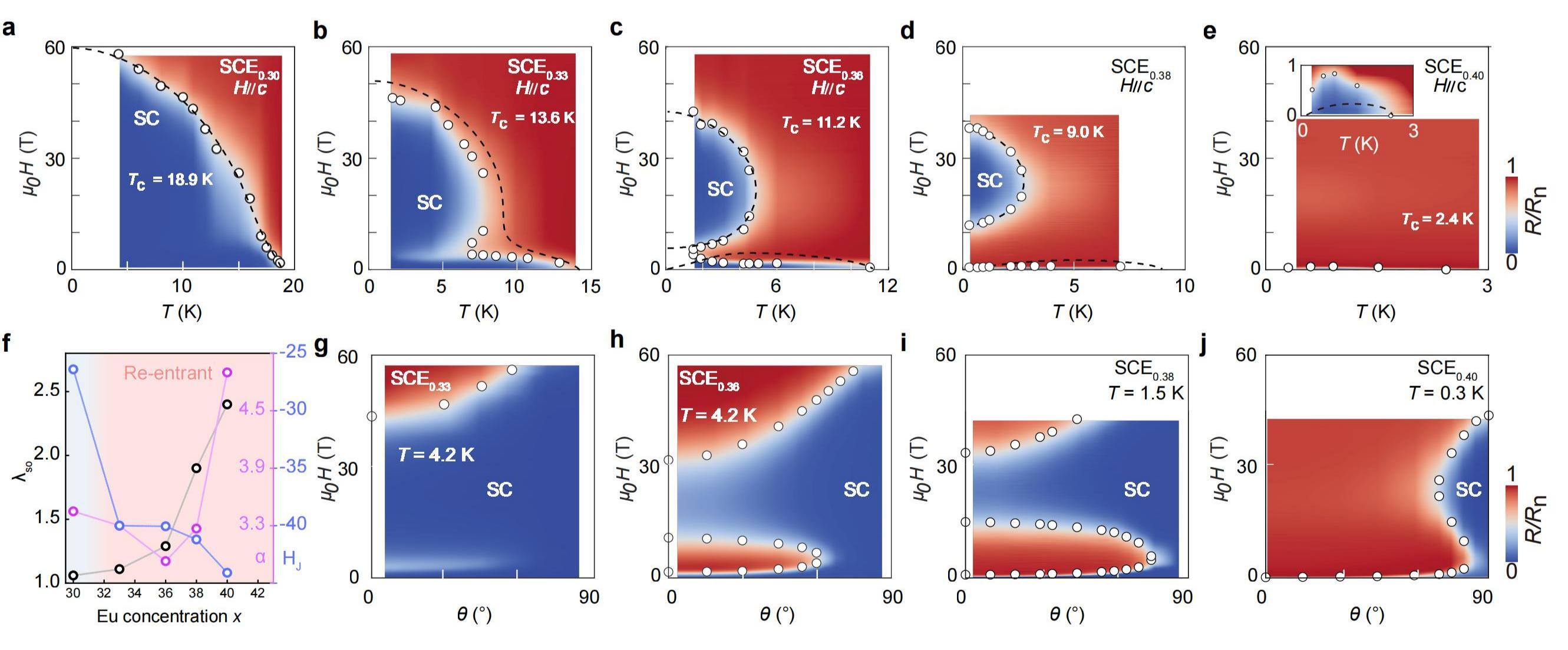图2.展示超导重入态的过掺杂SCEx(x=0.30、0.33、0.36、0.38、0.40)样品以及唯象拟合参数随掺杂浓度的依赖关系,SCE0.40高掺杂样品展现出了经典 Jaccarino-Peter (J-P) 补偿机制失效的物理特征,表明该组分可能存在额外物理机制。