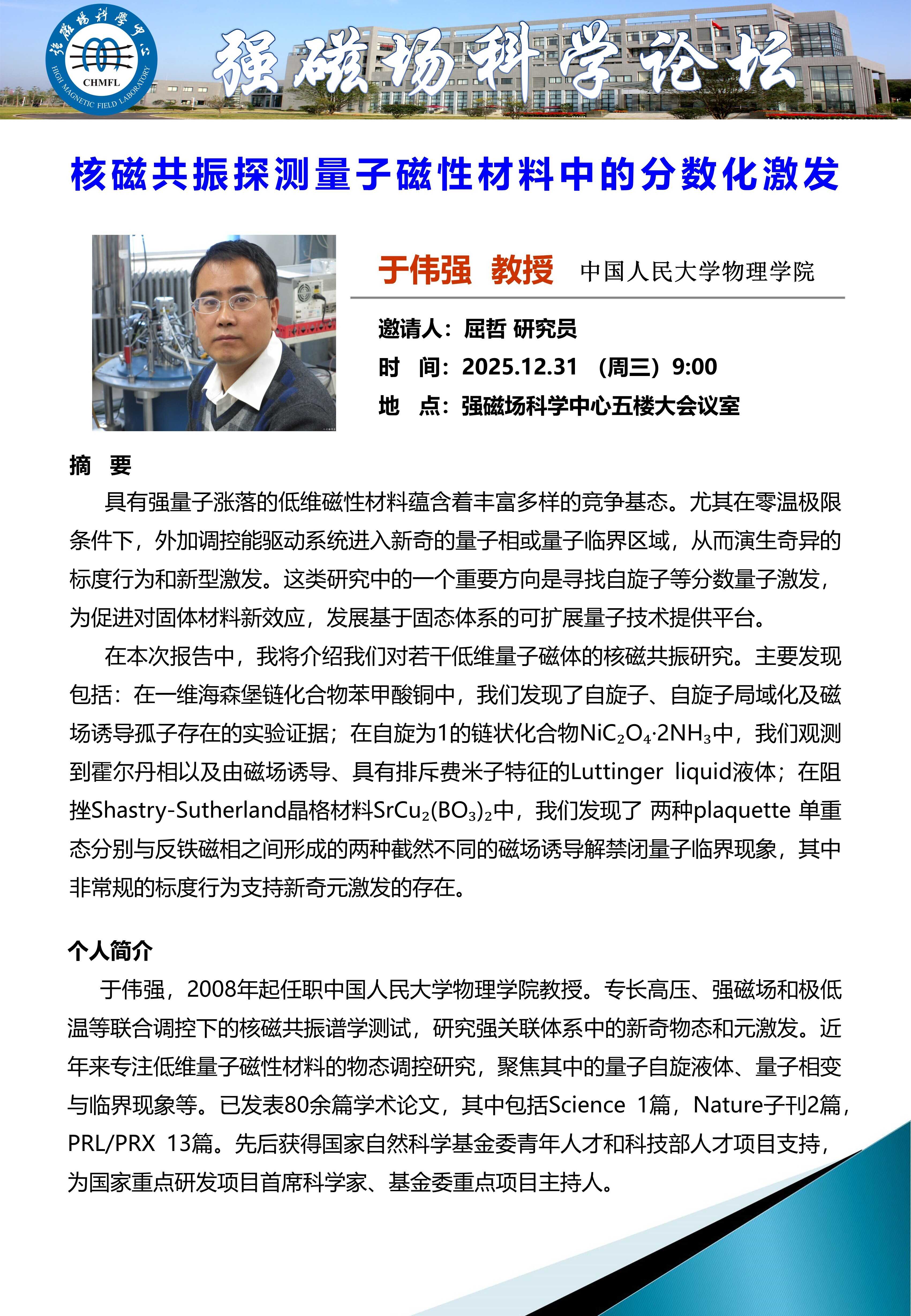 强磁场科学论坛:核磁共振探测量子磁性材料中的分数化激发