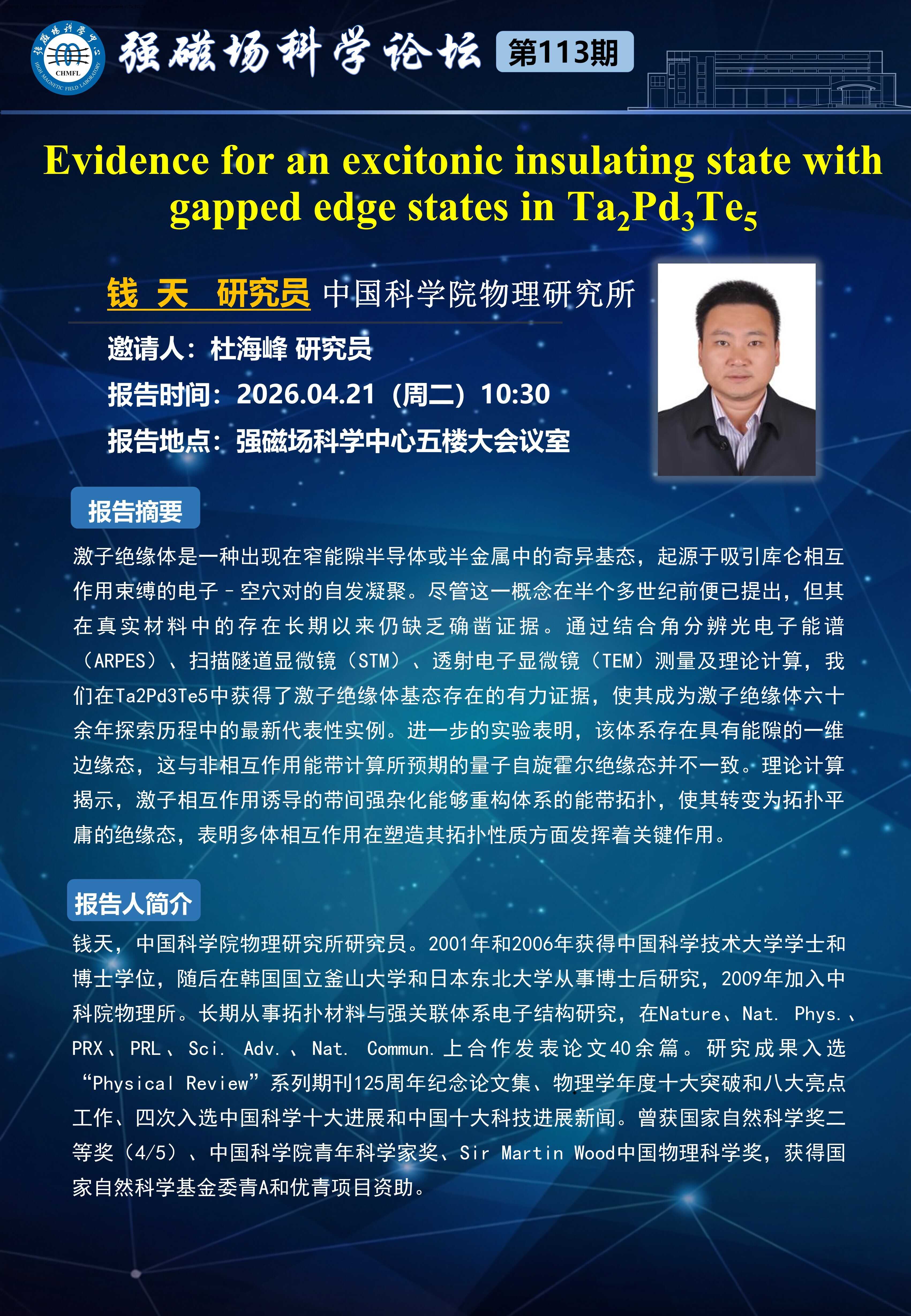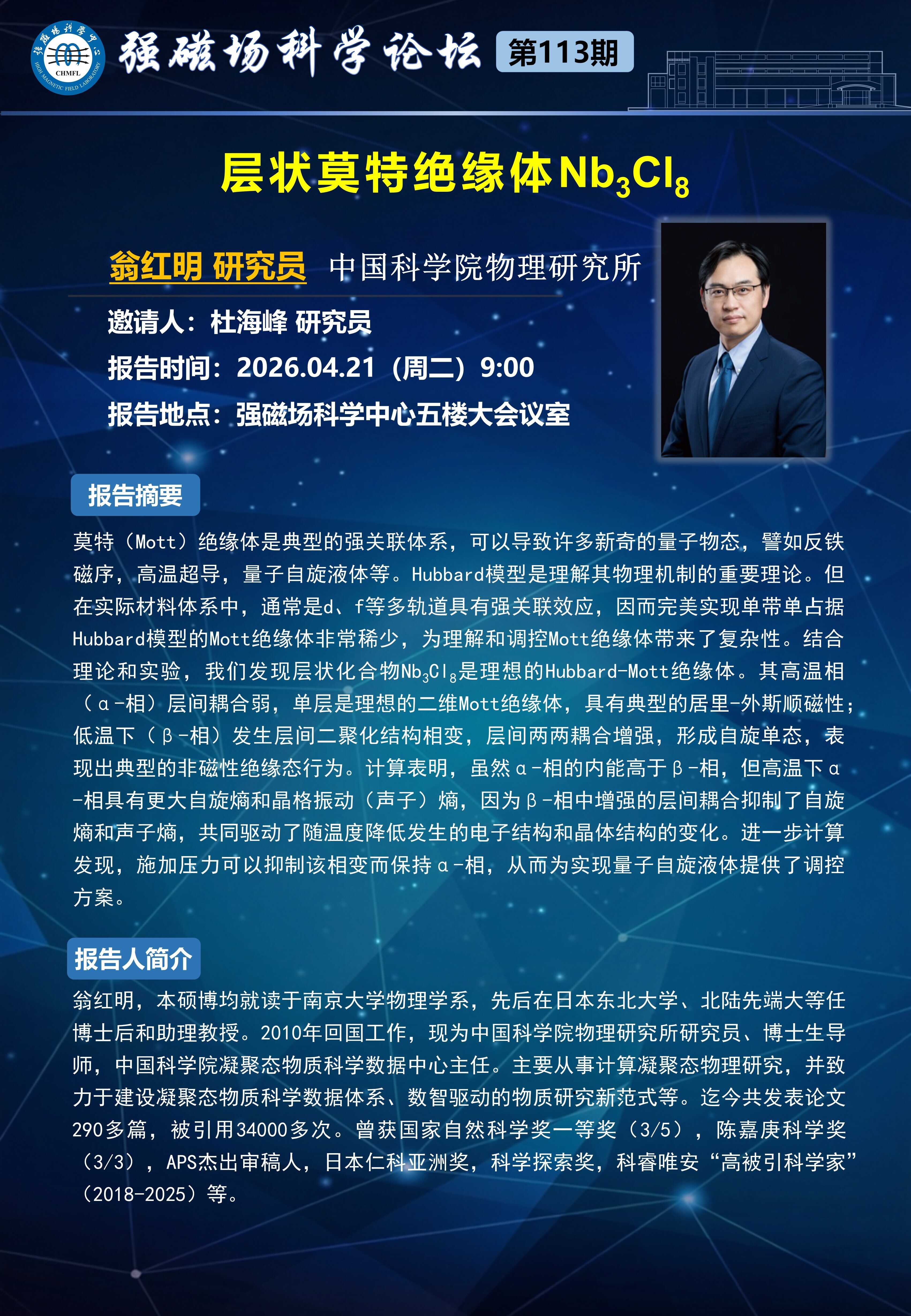 强磁场科学论坛第113期:层状莫特绝缘体Nb3CI8; Evidence for an excitonic insulating state with gapped edge states in Ta2Pd3Te5