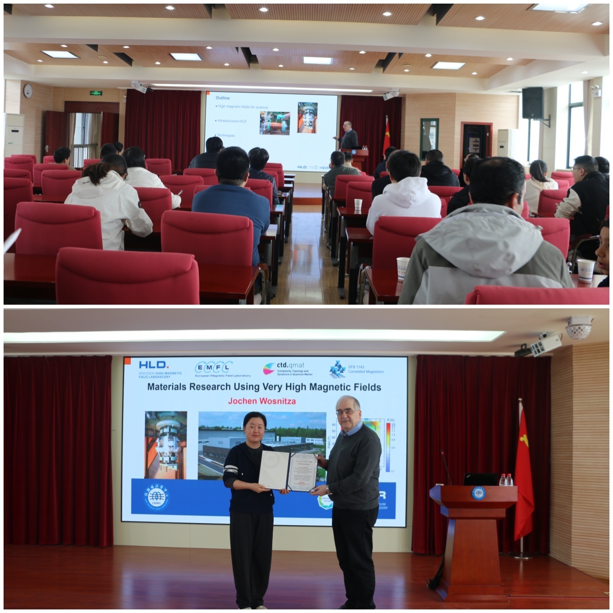 4月2日,Wosnitza教授做客强磁场科学论坛,作了题为“Materials Research Using Very High Magnetic Fields”(利用极高磁场进行材料研究)的学术报告。他详细介绍了德累斯顿强磁场实验室的核心设施与技术优势,并分享了其团队利用极端磁场探索强关联电子系统与拓扑材料的最新研究成果。报告会由王钊胜研究员主持,张欣研究员为Wosnitza教授颁发了纪念证书。